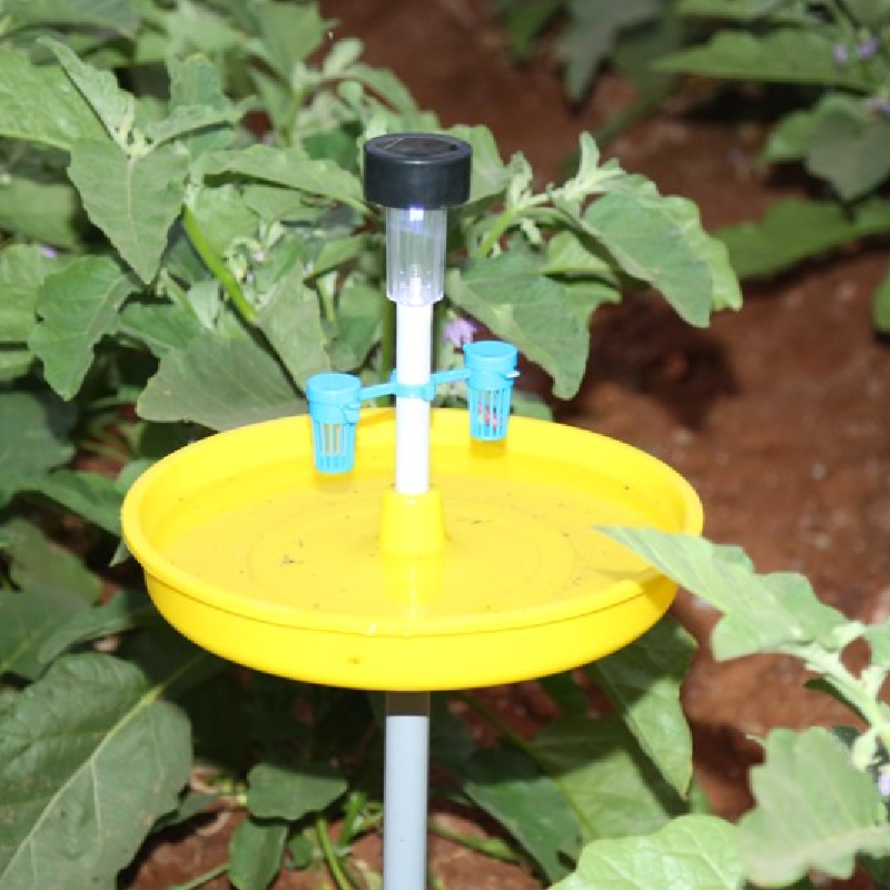PheroGlo is an insect trap that comprises of a round tub like container made of U V Stabilized Polypropylene, a central pipe stand to connect the solar powered light, two lure baskets on either side of the stand to hold pheromone dispensers and solar lamp assembly.